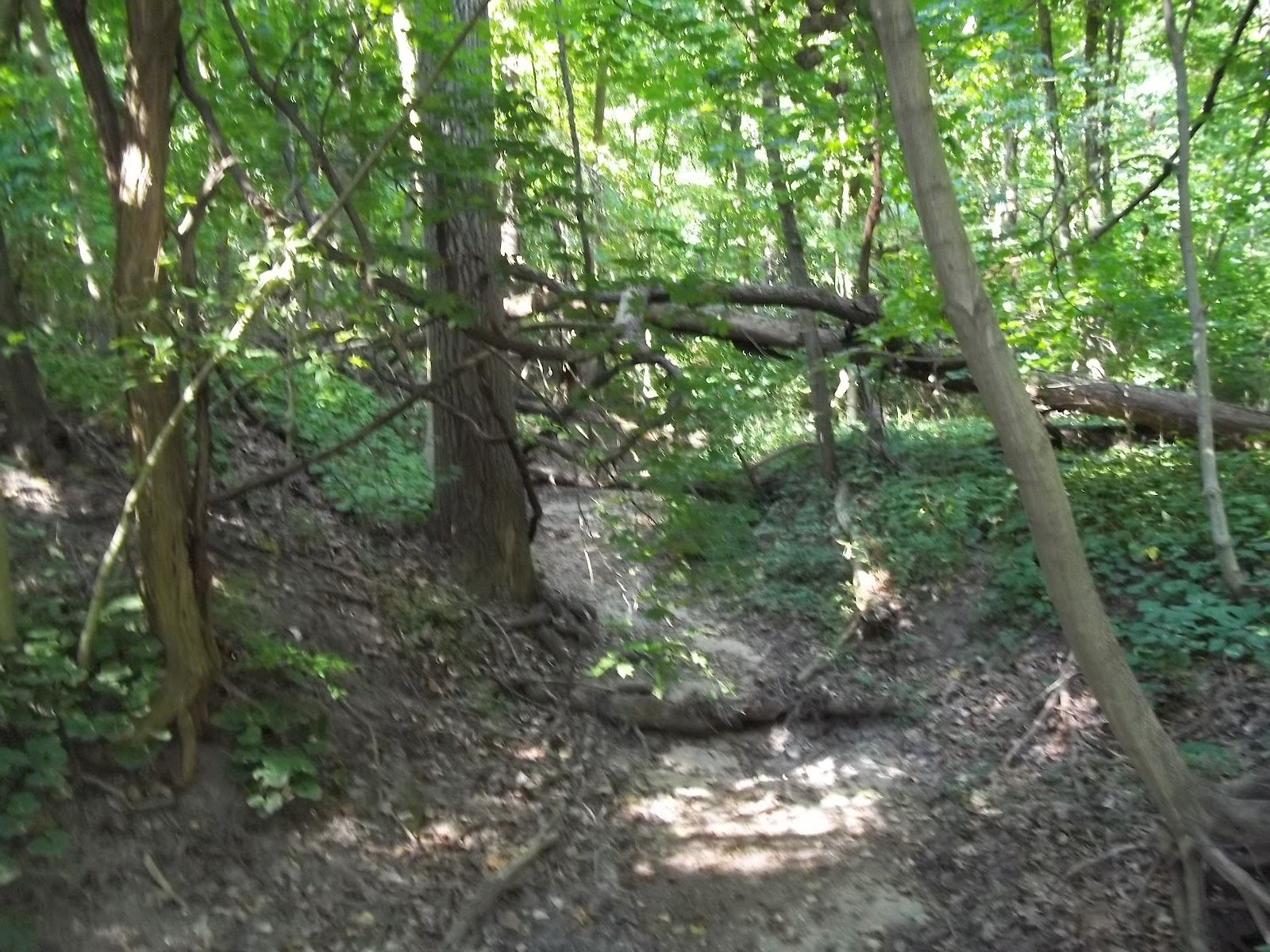 I accomplished one of my goals for this Summer season (even though it is still Spring for a few more days). I walked the Pimiteoui Trail from Grandview Drive to Forest Park and back this evening. The temperature was comfortable and most of the time there was a gentle breeze blowing. From Grandview Drive, steps lead down to the path. One continues going down a slope for some distance. The trail finally reaches the bottom of the valley and off to the right is an open area that I originally hoped was near the end of the trail. Nope, no luck with that thought.